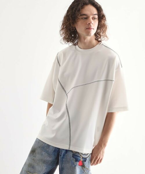 太さが異なる2種類のハンド風ステッチを施したTシャツ。