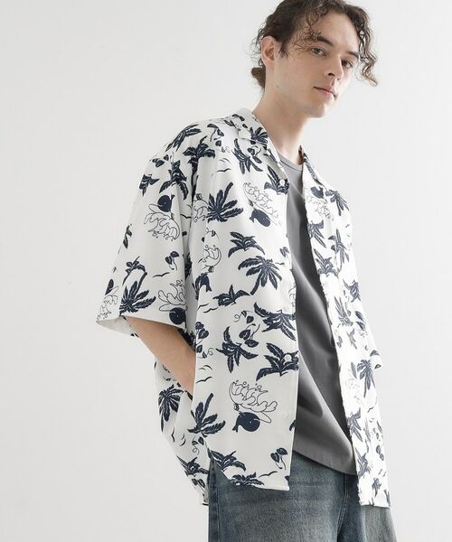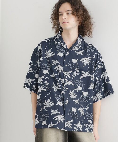 夏にぴったりなアロハ調のプリントの中に、サーフィンをするクジラがかわいらしいオープンカラーシャツ。