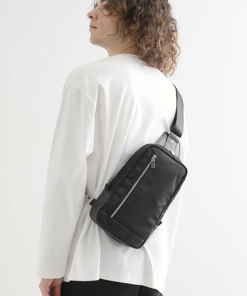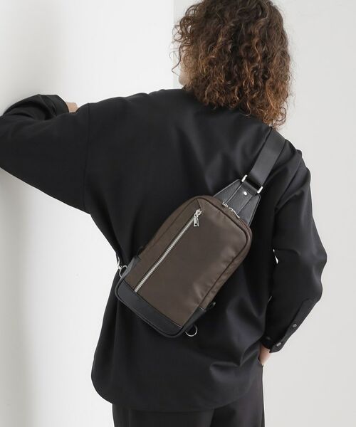 微光沢のある上品な見た目のナイロンと、自然な見た目のシボ感の合成皮革をコンビネーションしたワンショルダーバッグ。