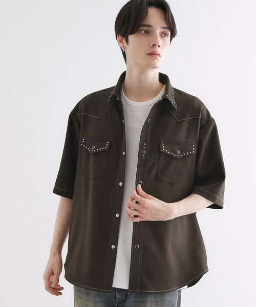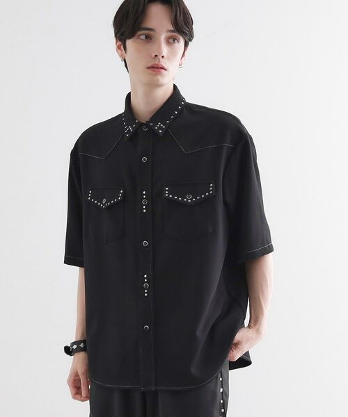 ウェスタンシャツの特徴である「切り替え」「パッチ&フラップデザイン」「パールドット釦」などのデザインに、スタッズを各所に散りばめた一枚。