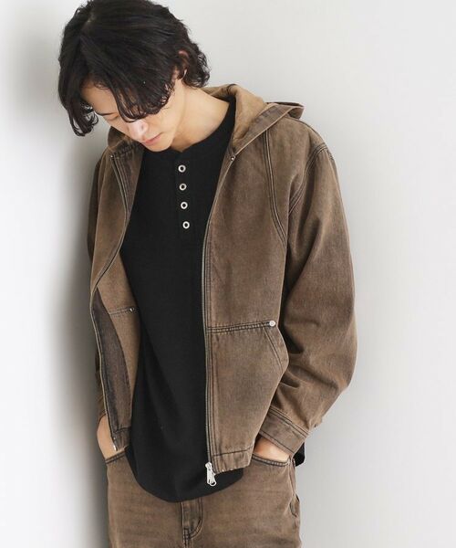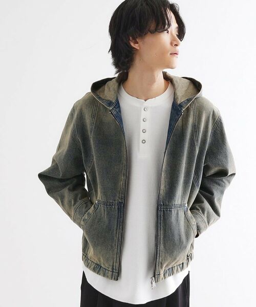 ヴィンテージライクな加工を施したジップフードシャツアウター。