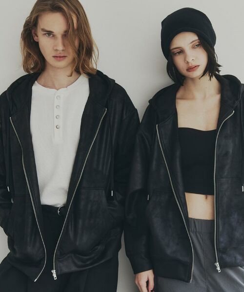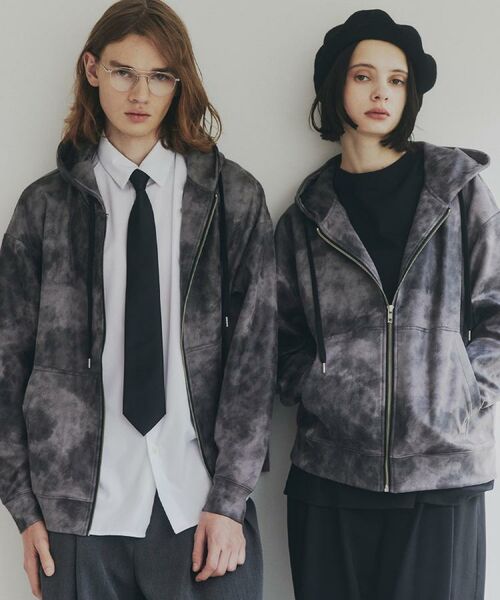 カジュアルな印象のパーカーもフラットで微光沢な素材にプリントを施すことで