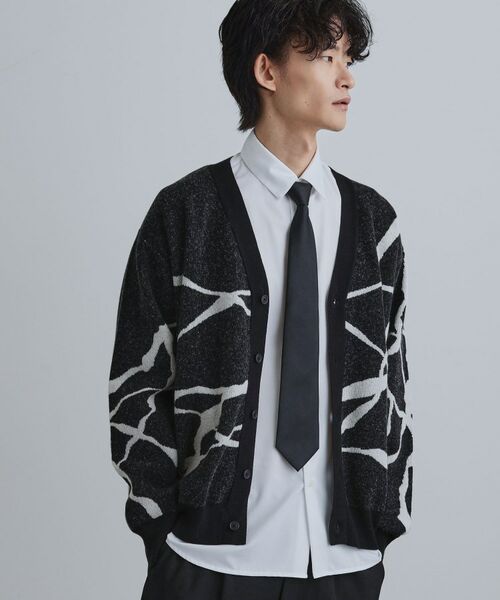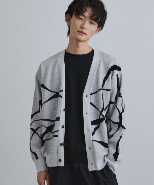 ストレッチ糸を混紡したストレート糸とパイルの糸の二種類を使った、ダブルジャカードのカーディガン。
