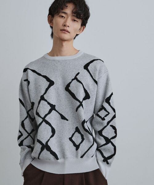 ストレッチ糸を混紡したストレート糸とパイルの糸の二種類を使った、ダブルジャカードのニットプルオーバー。