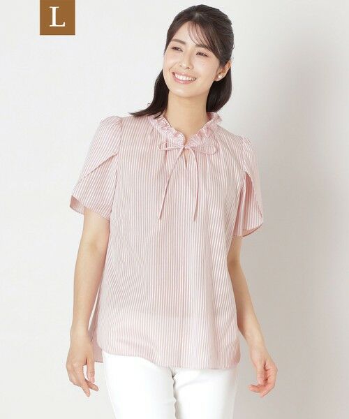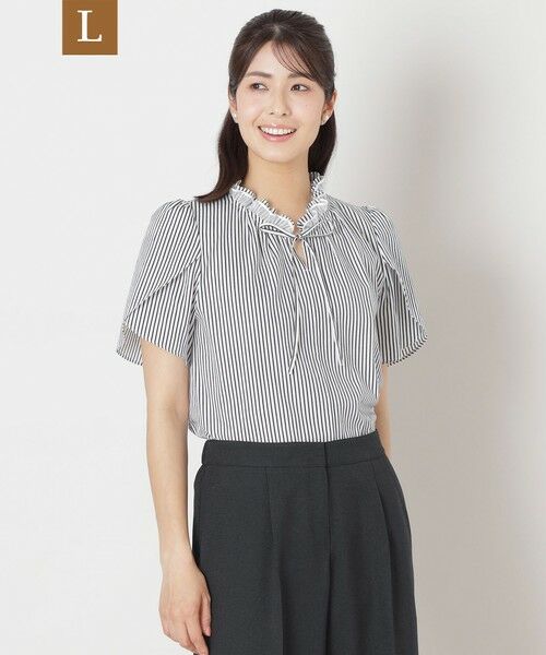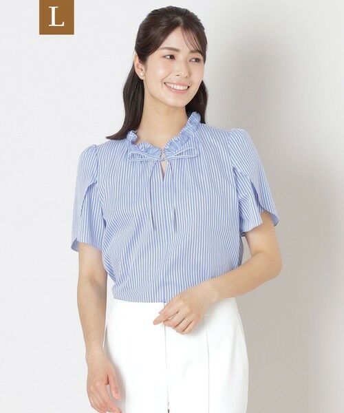 内側に共布、外側に透け感のある素材を重ねた二枚仕立ての立ちフリル衿に、共布の細リボンをあしらいました。袖はチューリップスリーブで、華やかさをプラスしています。スカート合わせはもちろん、パンツスタイルでもバランスよく着こなせる着丈で仕上げました。