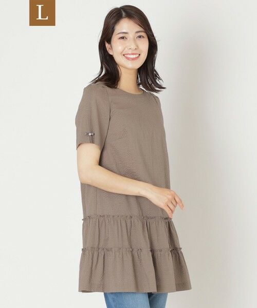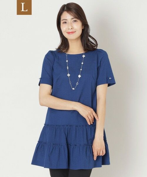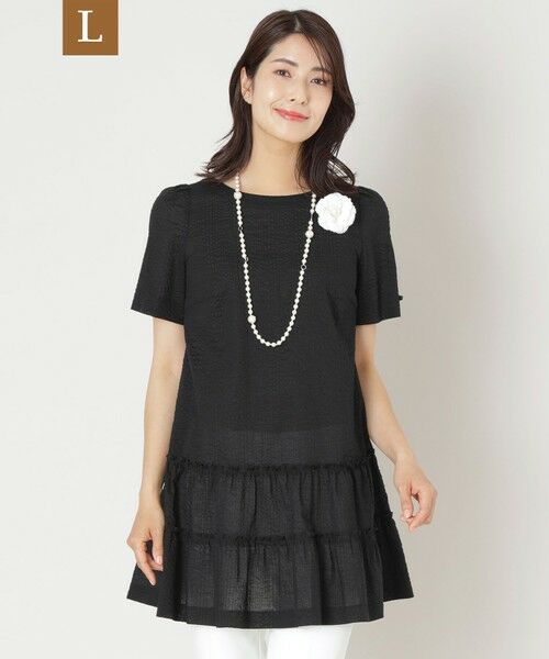 全体を縦長のすっきりとしたシルエットに仕上げ、裾には二段のティアードデザインを施すことで華やかなアクセントを添えました。