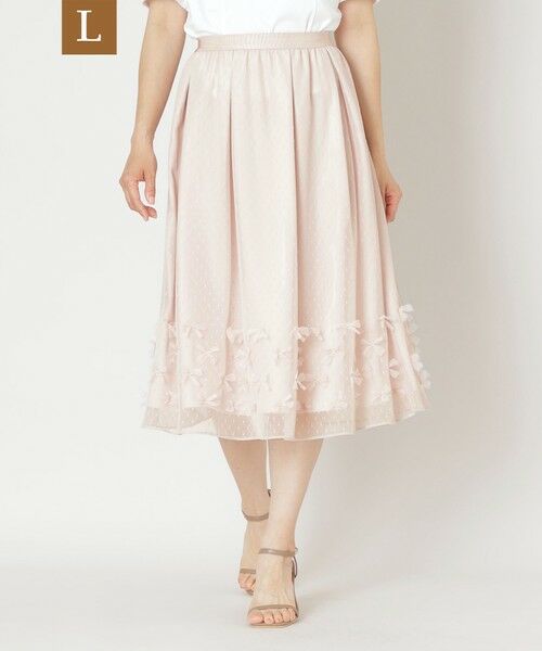 【L】リボンチュール ギャザースカートこちらの商品はラージサイズです。【素材】ふくらみのあるウーリー糸を使用し、柄部分にほどよい立体感を持たせた、愛らしいドット柄が特徴のジャカードチュール素材です。【デザイン・コーディネートポイント】BOXタックとギャザーを組み合わせてふんわりと仕上げた、ボリューム感のあるスカートです。裾部分にはリボンモチーフをあしらい、さりげない可憐さをプラスしています。※この商品はサンプルでの撮影を行っています。実際の商品とイメージ、仕様が異なる場合がございます。
