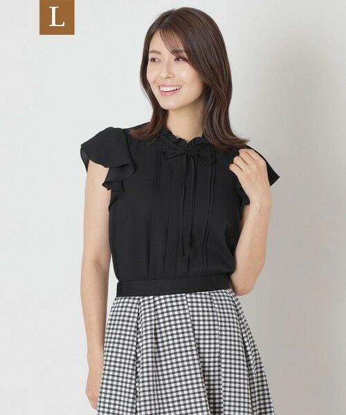 袖と襟元にあしらったフリルが華やかさを添える、可愛らしい印象のブラウス。さらりとした肌触りの合繊素材を使用しており、ご家庭でのお手入れも簡単。暑い季節にも快適に着用できる、実用性と美しさを兼ね備えた一枚です。共布のリボンは取り外し可能で、シーンに応じた着こなしをお楽しみいただけます。