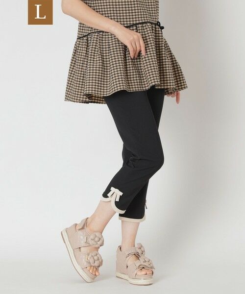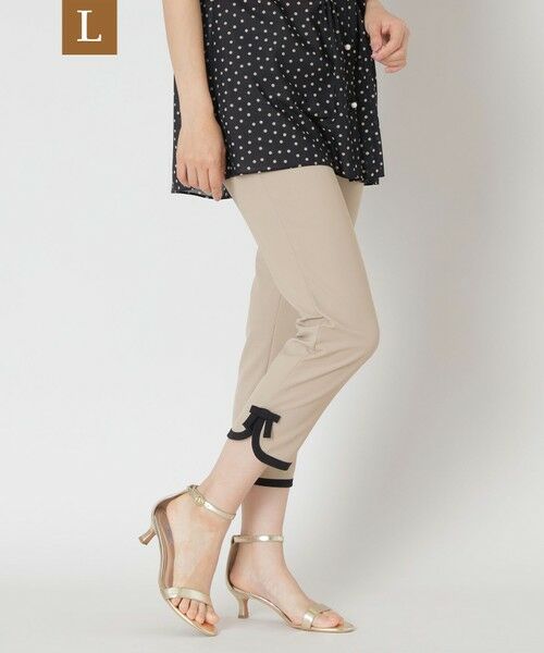 定番のスリムパンツをベースに、スリットから裾にかけて配色の切り替えを施し、同色系のリボンをあしらった可愛らしアクセントが光る一着。さりげないディテールがコーディネートに華やかさを添えスタイリングに軽やかさと可愛らしさをプラスしてくれる、万能なアイテムです。