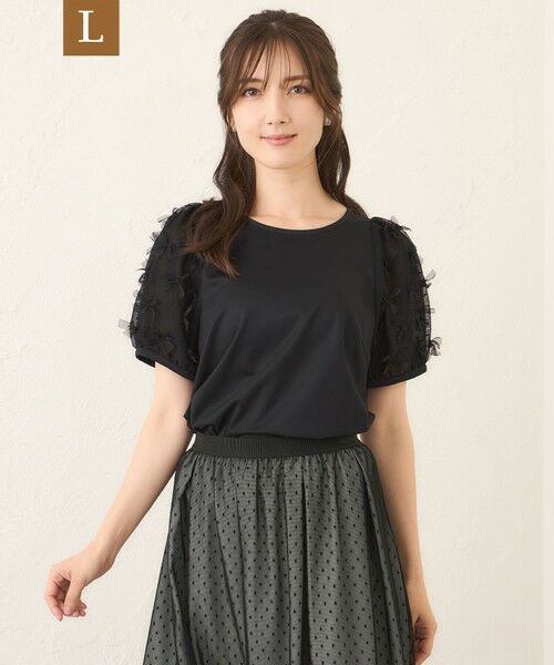【L】コマフリル カットソーコンビプルオーバーこちらの商品はラージサイズです。【素材】カットソー部分には、バイオ加工をはじめとする複数の工程を施し、生地の段階で毛羽を極限まで除去。目付バランスと高密度な編み立てにより、滑らかな風合いと美しい表面感を実現しつつ、熱伝導率を高めた接触冷感素材に仕上げています。別布には、見た目に特長があるフリルデザインのストレッチラッセルレースを使用しています。【デザイン・コーディネートポイント】細フリル生地にタックを入れてキャップスリーブ風に仕立て、衿ぐりにはビジューをあしらい、華やかな印象のカットソープルオーバーに仕上げました。※この商品はサンプルでの撮影を行っています。実際の商品とイメージ、仕様が異なる場合がございます。