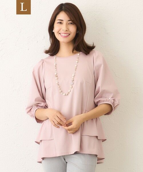 【L】ティアードフリル チュニックこちらの商品はラージサイズです。【素材】カットソー部分は生地の段階で毛羽を極限まで落とし、さらにバイオ加工など複数の工程を施すことで、上品できれいな表面感となめらかな風合いを実現した接触冷感素材です。清涼感があり、快適な着心地を叶えます。布帛部分はコンパクトで美しい表面感が特徴の、ストレッチ性のあるタフタ生地を使用しています。【デザイン・コーディネートポイント】袖口にタックとビジューをあしらい、裾は別布(タフタ)の二段フリルで華やかに仕上げた、カットソー素材とのドッキングチュニックです。※この商品はサンプルでの撮影を行っています。実際の商品とイメージ、仕様が異なる場合がございます。