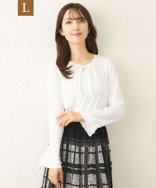 【L】リボンビジュー カットソーこちらの商品はラージサイズです。【素材】適度な伸縮性と程よい厚みを備えたニット生地を使用。表面は滑らかなスムース仕上げで、美しいドレープ性があり、着用時のシルエットを上品に引き立てます。通気性と快適性にも優れ、オールシーズンで活躍する汎用性の高い素材です。【デザイン・コーディネートポイント】襟ぐりに施したギャザーとリボンに、煌めくビジューをあしらい、袖口にはフリルを添えた、エレガンスカジュアルなデザインのカットソー。ディテールの華やかさが、優雅さを引き立てます。伸縮性のあるニット素材を使用しており、リラクシーな着心地も魅力。美しいシルエットと快適さを両立した、日常からお出かけまで幅広く活躍する一着です。※この商品はサンプルでの撮影を行っています。実際の商品とイメージ、仕様が異なる場合がございます。