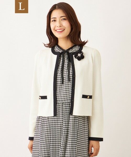 【L】バイカラー ショートカーディガンこちらの商品はラージサイズです。【素材】ニット部分には、レーヨンナイロンのストレッチ素材を使用。素材本来の程よいキックバックが快適な着心地を生み出し、強撚糸ならではの清涼感と、すっきりとした編み目が特徴です。TO BE CHIC定番の糸で、上品さと機能性を兼ね備えた仕上がりとなっています。【デザイン・コーディネートポイント】無地配色使いのクルーネックショート丈ニット羽織り。襟元には、無地タイプ限定でリボンコサージュが付属しており、さりげない華やかさを添えています。※この商品はサンプルでの撮影を行っています。実際の商品とイメージ、仕様が異なる場合がございます。