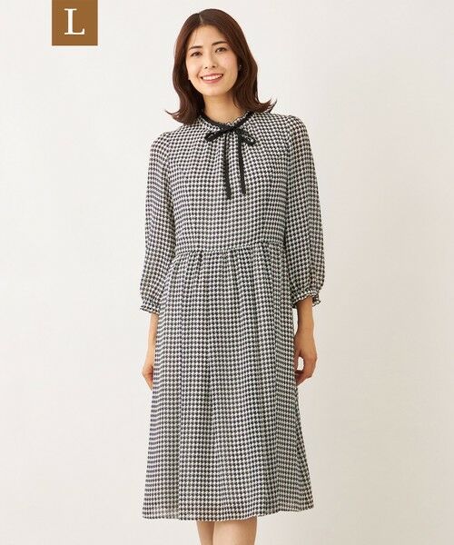 【L】ジョーゼット千鳥 ワンピースこちらの商品はラージサイズです。【素材】程よい透け感と軽やかさが特徴の、国産梨地ジョーゼットプリント素材。減量加工にこだわることで、ふんわりとしたソフトな肌ざわりに仕上げました。クラシカルな千鳥柄が、上品で洗練された印象を演出します。【デザイン・コーディネートポイント】ウエスト切り替えのフィット&フレアラインワンピース。上身頃はパネルラインで構成され、コンパクトなシルエットに。襟元には共布のフリルを挟み込み、別布の黒リボン(取り外し可能)をアクセントとして添えました。クラシックな雰囲気が漂う、エレガントなワンピースです。※この商品はサンプルでの撮影を行っています。実際の商品とイメージ、仕様が異なる場合がございます。