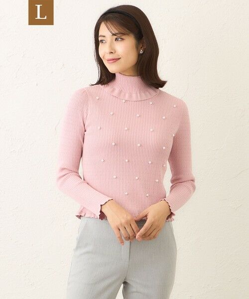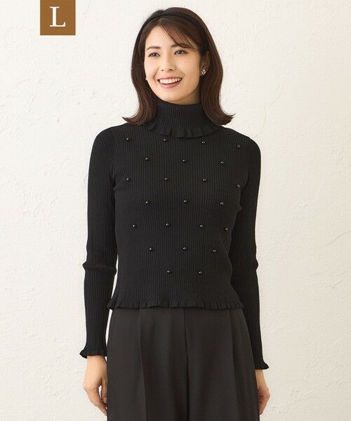 クルーネックのケーブルリブニットに、前身頃へパール調パーツをあしらった華やかなプルオーバーです。タートル風のフリルスヌード襟が付いており、エレガントな印象を演出します。