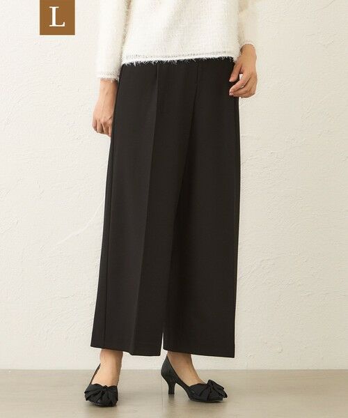 表側はきれいめなジョーゼット組織、裏側は起毛仕上げで温かみのある素材を使用したワイドパンツです。1本タックにセンタープレスを施し、上品で脚長効果のあるシルエットに仕上げました。ウエスト部分には、ラインストーン入りのフラワーモチーフボタンをあしらい、さりげない華やかさをプラスしています。