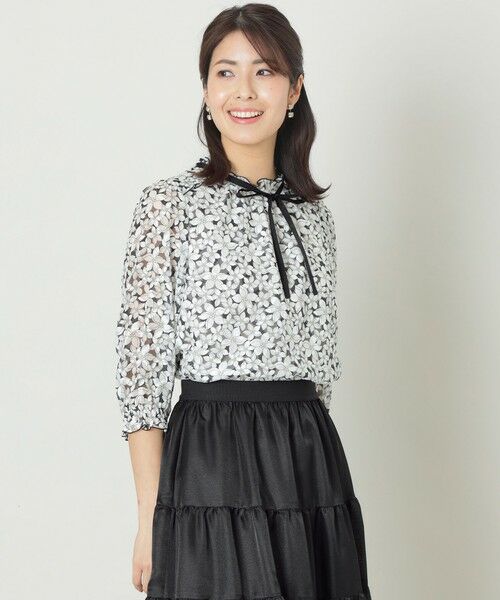ジャスミンプリントリボン ブラウス【素材】変形格子ジャカード生地にジャスミン柄をプリントする事により、奥行きのある陰影効果を表現したこだわりの生地です。また適度なハリとコシ感も特長です。 【デザイン・コーディネートポイント】襟元には共布フリルと、取り外し可能なサテンリボンがデザインポイントのブラウス。お袖口はシャーリングゴム仕様で袖丈を調節可能で裾をインしてスカートスタイルでも、アウトでパンツスタイルでも着用可能な汎用性の高さも特長のブラウスです。※この商品はサンプルでの撮影を行っています。実際の商品とイメージ、仕様が異なる場合がございます。