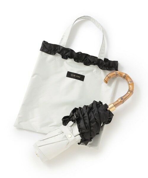 表面は無地、内側はランダムドットのプリントを施した折りたたみタイプの晴雨兼用傘。傘の縁を配色のフリルでトリミングし、バンブーのハンドルでエレガントなデザインです。傘袋は大きめで傘を収納しやすく、ドット釦を留めるとコンパクトに収納できます。紫外線遮蔽率99.9%以上で日傘として、晴雨兼用なので雨の日にもお使いいただけます。バンブーは天然素材ですので大きさ・形・色・節の部分のでかたに個体差がございます。予めご了承ください。