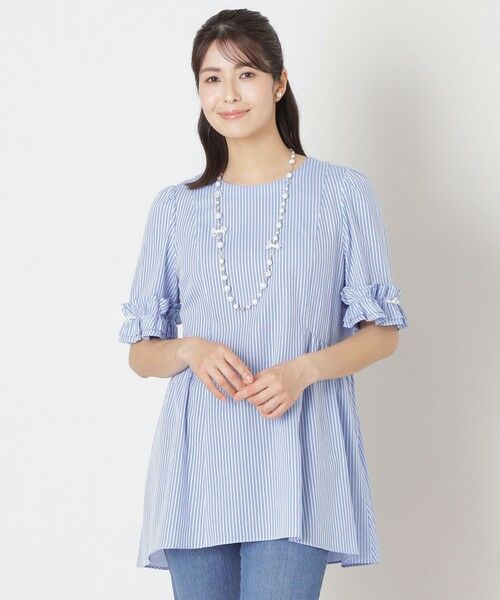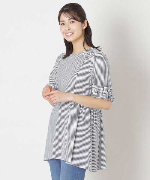 ショルダーからのパネルラインによる縦長効果のあるルエットパターンです。脇から後ろにかけてのパネルラインにウエスト切替を施し、ギャザーを寄せてバックテールの裾デザインに仕上げました。袖口には共布のフリルを二枚重ね、中央にはビジューモチーフをあしらって華やかさをプラスしています。カラミ組織のストライプ柄に、エレガントなディテールを添えたチュニックブラウスです。