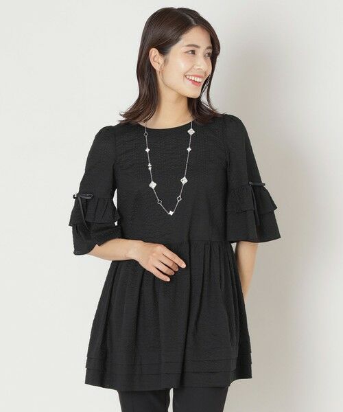 ハイウエストで切り替えたチュニックブラウス。袖口には共布のフリルを二段重ねにし、動きのある華やかな印象に。切り替え部分には別布を挟み込み、リボンの中央には花型のクリスタルパーツをあしらって、上品なアクセントを添えました。裾にはタックを施し、さりげない立体感と表情を加えています。