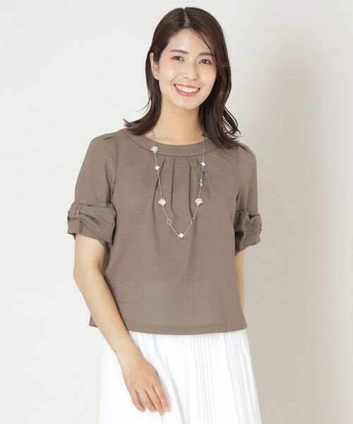 フロントに施したギャザーが印象的なブラウス。袖口にはリボンのワンポイントをあしらい、さりげないフェミニンさが引き立つデザインに仕上げました。