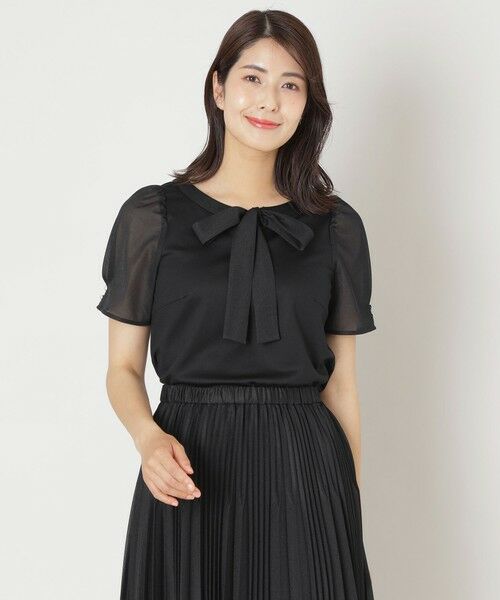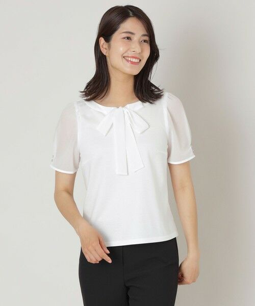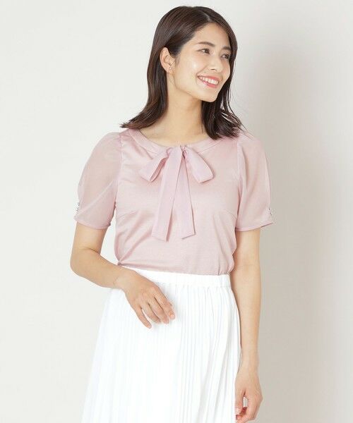袖にタックを入れ、ガラスビジューをあしらうことで華やかさを添え、襟元には別布でリボンをあしらったデザインカットソーに仕上げました。