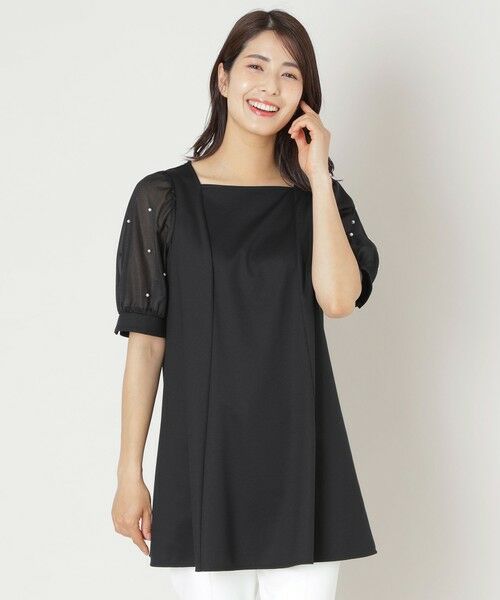 袖に繊細な別布を重ね、パールビジューをドットのように上品に散りばめることで、華やかさの中にも洗練された輝きをプラス。袖口にはカフスをあしらい、優雅な雰囲気に仕上げたエレガントなチュニックです。