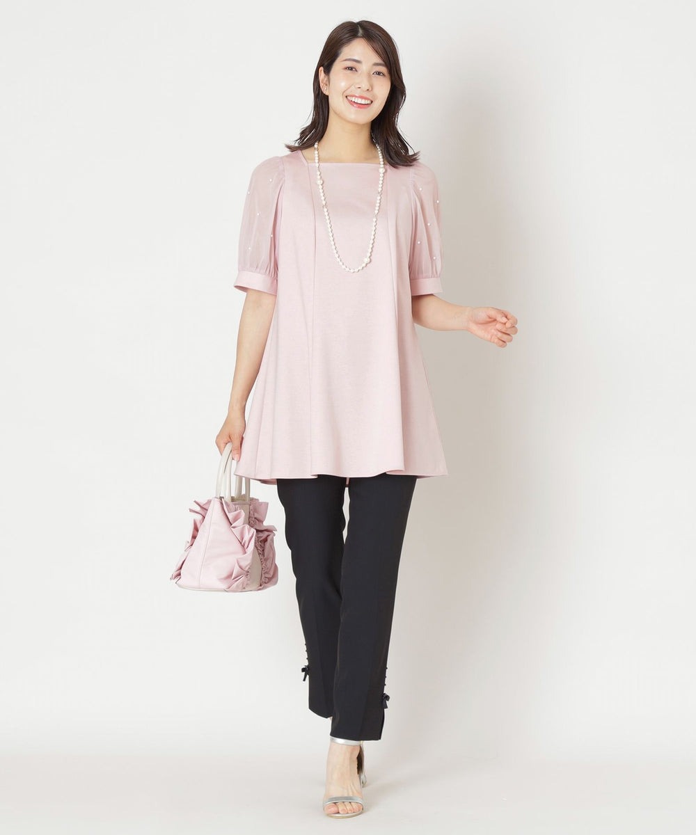袖に繊細な別布を重ね、パールビジューをドットのように上品に散りばめることで、華やかさの中にも洗練された輝きをプラス。袖口にはカフスをあしらい、優雅な雰囲気に仕上げたエレガントなチュニックです。