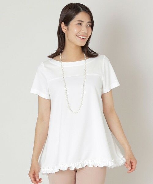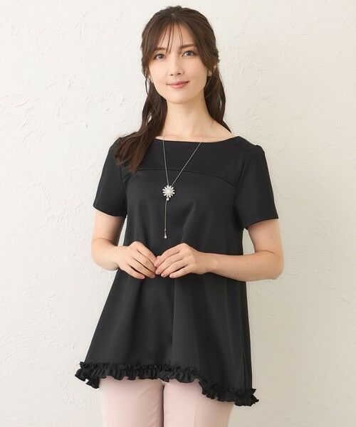 異素材の切り替えと立体的なフォルムが印象的な、デザイン性の高いチュニックアイテムです。シンプルなシルエットにフリルの甘さを添え、大人の可愛らしい雰囲気に仕上げました。