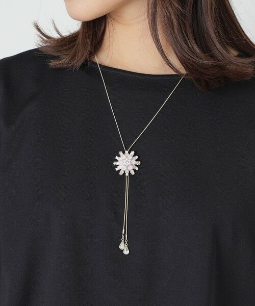 フラワービジュースライドネックレスガラスビジューとパール調パーツを組み合わせた立体感のあるフラワーモチ-フのスライドタイプのネックレスです。フラワーモチーフは繊細なガラスの丸パーツや長方形パーツで構成して中心部分はパール調パーツで飾りました。光があたると輝きが美しく顔周りをとても華やかにみせてくれます。※この商品はサンプルでの撮影を行っています。実際の商品とイメージ、仕様が異なる場合がございます。