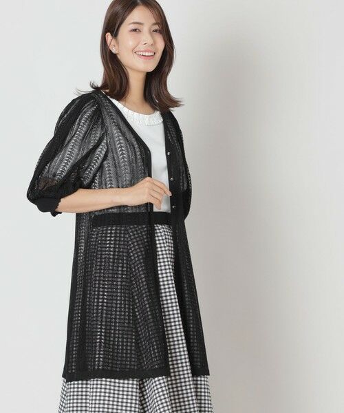 全面に透かし編みを施した、非常に繊細で軽やかな印象のニットカーディガンです。旬のインナーとレイヤードして、スカートにもパンツにも幅広くお楽しみいただけます。パンツは裾のスリットに、ブラックのリボンとパールビジューをあしらい、足元にさりげない華やかさを添えました。