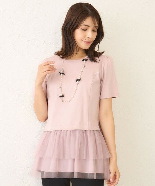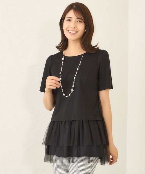 チュールネットコンビ チュニック【素材】生地の段階で毛羽を極限まで取り除き、さらにバイオ加工など複数の加工工程を施すことで、上品な光沢感と滑らかな風合いを実現しています。【デザイン・コーディネートポイント】カットソーとチュール素材をドッキングしたエレガントなチュニックです。バックスタイルはチュールと裏地の二重仕立てで、軽やかで洗練された印象に。ヒップラインにはゴムを配しつつ、全体はゆったりとしたシルエットで、美しいドレープ感を演出しています。※この商品はサンプルでの撮影を行っています。実際の商品とイメージ、仕様が異なる場合がございます。