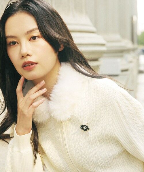 ミニサイズのカメリアブローチはエポキシ樹脂でカラーリングして、繊細なガラスパーツが花びらのラインを華やかに彩ります。揺れる下がりのパール調パーツとの組み合わせでより可愛らしい仕上がりにしました。小さいカメリアモチーフですが、立体感と重なり合う花びらで奥行きのあるコーディネートに映えるブローチです。