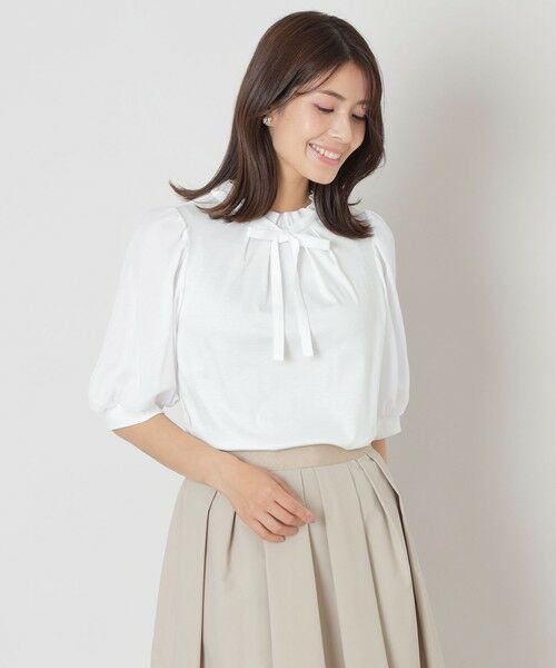 コットンポンチ カットソー【素材】ハイゲージで編んでいるため、織物のようなきめ細やかな表情をしています。捲縮エステルを使用することで、伸縮のある生地になっています。光沢を引き出すためシルケットとガス焼き加工を施し、毛羽を極限までカットしてドレープのきいた伸縮性のあるファブリックに仕上げています。【デザイン・コーディネートポイント】袖に別布使いのリボン帯仕様のカットソープルオーバーです。※この商品はサンプルでの撮影を行っています。実際の商品とイメージ、仕様が異なる場合がございます。