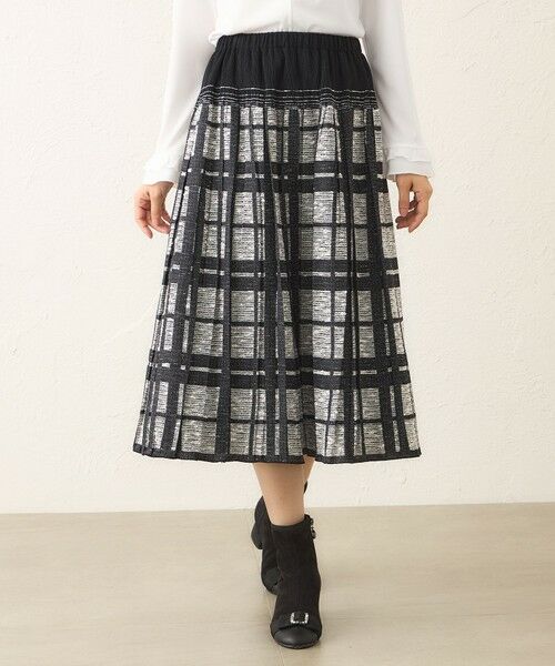 ツイード調ジャカード スカート【素材】2種類の意匠糸を使用してチェック柄を表現したツイード調素材は、レーヨン糸を組み合わせることで、柔らかさと美しい落ち感を実現。上品でありながら、動きのある表情が魅力です。さらに、ジャカード織機の技術を活かし、部分的にポリウレタン糸(ゴム)をヨコ糸として織り込むことで、ゴムシャーリングを表現。その部分だけを自然に絞り、立体感とフィット感を生み出しています。【デザイン・コーディネートポイント】ウエストはゴム仕様で伸縮性があり、快適な着心地を実現。お腹周りには細かいプリーツを施すことで、すっきりとした印象に仕上げました。裾に向かって広がる華やかなシルエットが、全体のバランスを美しく引き立てます。※この商品はサンプルでの撮影を行っています。実際の商品とイメージ、仕様が異なる場合がございます。