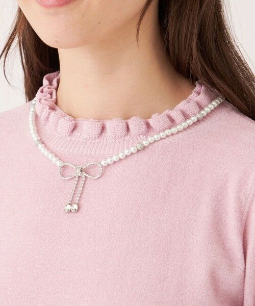 トップリボン ネックレスパール調パーツを基調にガラスリボンをネックレストップにあしらった可愛く華やかなネックレスです。ホリデーシーズンにふさわしいきらきらと輝くリボンが顔まわりを明るく華やかにみせてくれます。リボンの先の揺れるパーツもより一層可愛く見せてくれるポイントです。冬のワンピース、シンプルニットトップや毛足のあるニットにも相性がよくコーディネートの仕上げにおすすめです。※この商品はサンプルでの撮影を行っています。実際の商品とイメージ、仕様が異なる場合がございます。