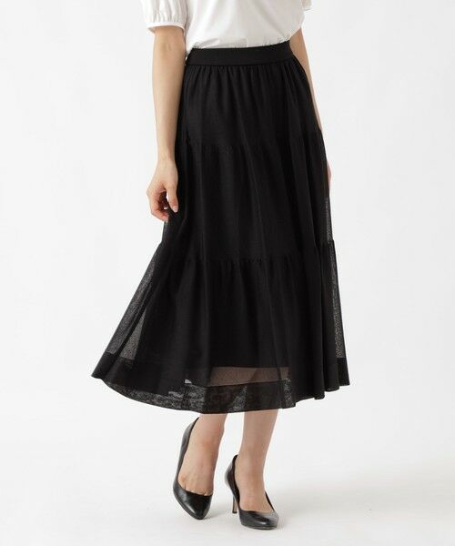 エアハイゲージ スカート【素材】レーヨンフィラメント原料に上品な光沢のナイロンを交撚したハイゲージヤーンです。清涼感と軽さが特徴です。【デザイン・コーディネートポイント】張りのあるニットを一本取りでハイゲージで編み上げ、ティアード上に編みでタックを表現したエレガントなニットスカートです。軽くて穿き心地の良いスカートです。※この商品はサンプルでの撮影を行っています。実際の商品とイメージ、仕様が異なる場合がございます。モデル(代表画像):H 165 B 78 W 58 H 85 着用サイズ:40