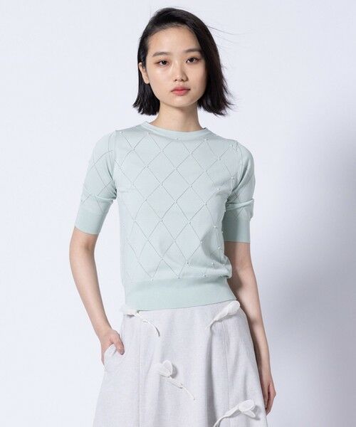 ダイヤ柄のアイレットと小粒のパールビーズで、上品な華やぎ感をプラス。