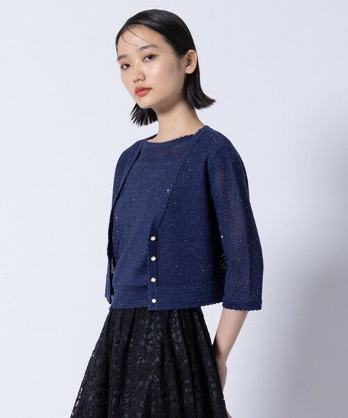小さなスパンコールが編み込まれたメッシュカーディガンです。光があたるとやわらかに輝きます。程よい上品な透け感があり、いつものスタイリングにプラスするだけで、トレンドを感じるコーディネートが完成します。裾には、フリルや波のような曲線を作り出す編み方のデザインをあしらうことにより、優雅で華やか、フェミニンな印象に。ボタンはTOCCAオリジナルのクローバーボタンを使用し、上質感を添えた素敵な1枚になりました。