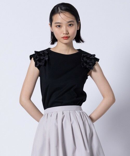 2025 SPRING COLLECTION BOW PARTY ボウパーティー こちらの商品は、ご家庭で水洗いできる商品です。 プチフリルと可愛らしいリボンがアクセントとなり、フェミニンでエレガントな印象を与えるTシャツです。シンプルなボディラインに仕立てられているため、どんなスタイルにも合わせやすく、着回し力抜群。程よいサイズ感で、体のラインを程良くカバーしつつも、女性らしさを引き立ててくれます。柔らかなカットソー素材は肌触りがよく、デイリーユースにも最適。1枚で、シンプルでありながらも華やかさを感じさせ、着る人を引き立ててくれるアイテムです。 【素材】 発色性が良く光沢感のある素材。適度なドレープ感とソフトな風合いが特徴です。 ☆生地の厚さ:普通 ☆伸縮性:ややあり ☆透け感:ややあり洗濯表示【本体のみ】40℃まで弱洗濯可 塩素系漂白不可 タンブル乾燥不可 日陰つり干し乾燥 アイロンは160℃まで ドライクリーニング可 弱いウェットクリーニング可