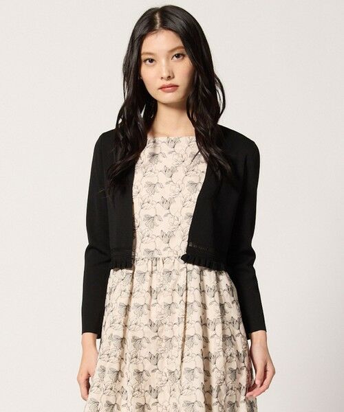 2025 PRE FALL COLLECTIONFRILL BOLERO フリル ボレロ こちらの商品は、ご家庭で水洗いできる商品です。 ドレスに合わせやすいボレロのニットです。裾にフリルとアイレットを入れて甘いデザインにしていますが、シックなカラー展開なので、大人なフェミニンスタイルになります。 さっと羽織るだけでドレスにきちんと感がプラスされる優れたアイテム。デイリーだけでなくきちんとした場面やオケージョンにも着まわせて、1枚持っておきたい羽織りです。【素材】 ストレッチ性があり体の動きに柔軟にフィット。 優しい肌触りで毎日着たくなる着心地です。 【機能】紫外線90%以上カットする素材を使用しています。 接触冷感素材を使用しています。 ☆生地の厚さ:普通 ☆伸縮性:ややあり ☆透け感:無し洗濯表示【本体のみ】40℃まで手洗い可 塩素系漂白不可 タンブル乾燥不可 日陰平干し乾燥 アイロンは120℃まで 弱いドライクリーニング(石油系)可 弱いウェットクリーニング可