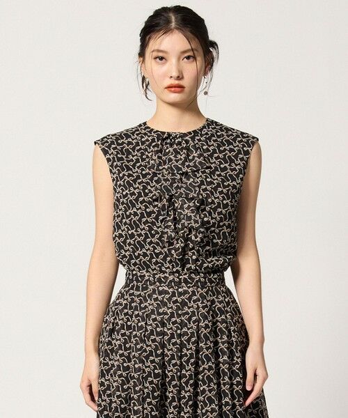 胸元のフリルは大胆で美しいラッフル。シックなプリントと可憐さを両立させました。