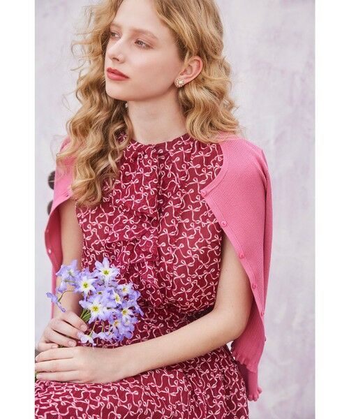 リボンをチェーン状に連ねて幾何学模様に見せた、遊び心あるデザインのプリントブラウスです。