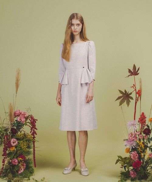 ツイードライクな表情が上品でストレッチ性のあるジャカード素材のドレス。 ボディラインを拾いにくいシルエットながら、スカート部分はすっきりと見える緩やかなAライン。ヒップや太ももまわりにも程よいゆとりを持たせ、動きやすさに配慮しました。ウエストにはペプラムデザインをあしらい、気になる腰まわりをやさしくカバーしつつ、華やかなアクセントに。きちんとした場にも着やすいエレガントなデザインです。