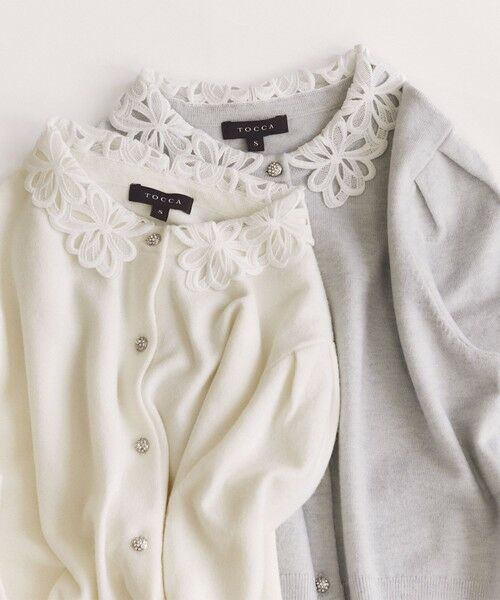 TOCCAオリジナルのエンブロイダリーレースを贅沢にあしらった、上品な表情のカーディガン。まるで繊細なレースブラウスをレイヤードしているかのようなデザインで、1枚で着映えする華やかさとエレガンスを兼ね備えたアイテム。前をすべて留めてプルオーバーのように着用すれば、きちんと感のあるトップスとして、スカートやパンツと合わせたスタイリングにぴったり。オフィスやきちんとしたシーンにも対応できる上品さを持ちつつ、羽織りとしても使える着回し力の高い一着です。