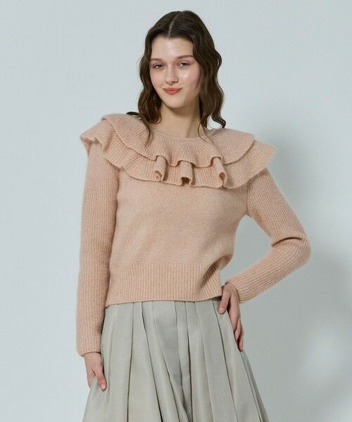 2025 WINTER COLLECTION ROMANTIC FLUTTER ロマンティック フルッター ふんわりと柔らかく、空気を含んだような軽やかさが魅力のモヘヤ素材に、繊細なスパンコールを散りばめた、華やかな印象のニットプルオーバー。動くたびにやさしくきらめく光には、まるで澄んだ夜空に瞬く星のようなロマンティックさがあります。 胸元には立体感のあるドラマティックなフリルをあしらい、顔まわりを華やかに彩るデザインに仕上げました。 スカートと合わせるとフェミニンな装いに、パンツスタイルだとこなれ感のある洗練されたスタイルに。スタイリング次第で雰囲気を変えて楽しめる、着回し力の高い一枚です。【素材】モヘヤのなかでも最上級のスーパーキッドモヘヤを使用しており、チクチク感を感じにくく柔らかくて軽やかな素材。 モヘヤの光沢感と保湿性もあります。☆生地の厚さ:厚い ☆伸縮性:ややあり ☆透け感:無し洗濯表示【本体のみ】洗濯不可 漂白不可 タンブル乾燥不可 アイロン不可 弱いドライクリーニング(石油系)可 ウェットクリーニング不可