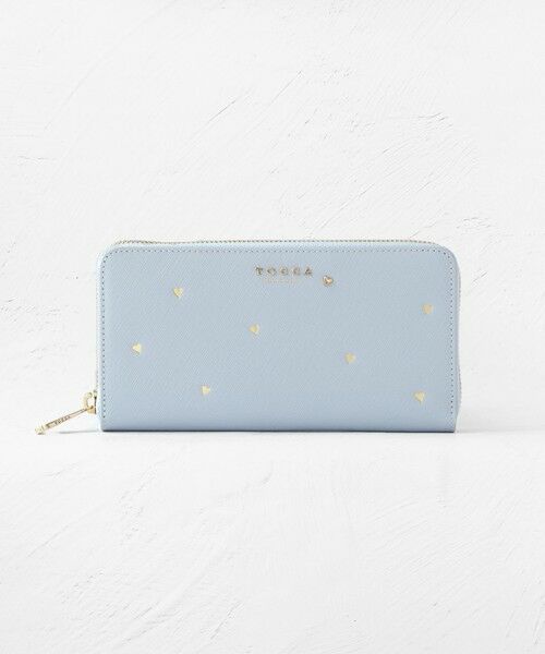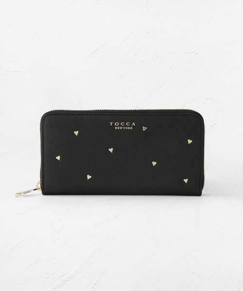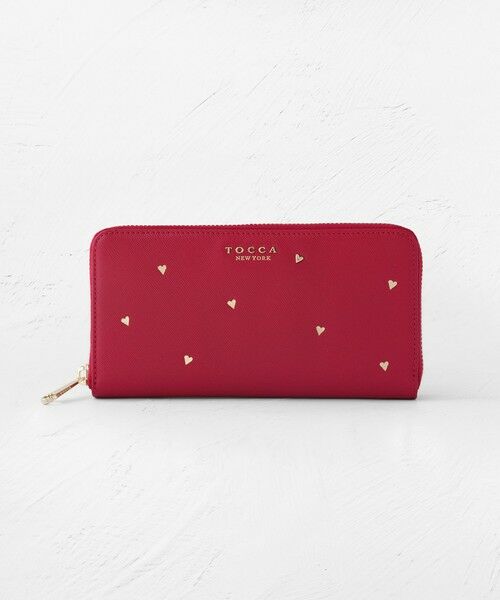 小さなハートたちを全体に散りばめたデザインが大人可愛いロングウォレット。箔押しのハート柄の中に1つだけメタルパーツが潜むリズミカルでリュクスなテクスチャーがおしゃれで、ロマンティックなムードとTOCCAならではのセンスが光ります。