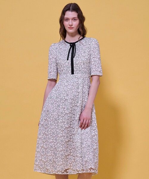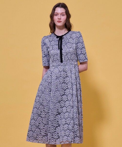 繊細なレース素材を贅沢に使用したエレガントなドレス。レースならではの立体感と繊細さを楽しめる、フェミニンで洗練されたアイテムです。程良い透け感が軽やかさを演出し、女性らしい上品な華やかさを引き立てます。ネックラインには細いリボンをあしらい、クラシカルで可憐なアクセントをプラス。フィット感のあるウエスト切り替えと、自然に広がるスカートラインが美しいシルエットを叶えます。 特別なシーンにぴったりなデザインで、結婚式やお食事会等華やかな場面におすすめ。