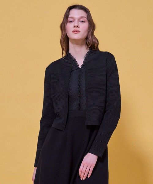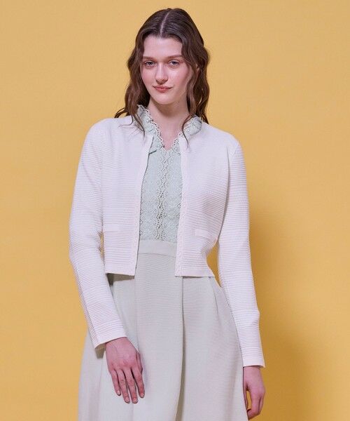 レーヨン混のさらりとした落ち感もありジャケット見えする綺麗めな印象のニットカーディガン。全体がのっぺりせず表情感のある見え方になるボーダー柄で、前立てには生地表面にポコポコとした花柄のポップコーン素材を並べて、フェイクポケットをオン。上品な中にも可愛らしさを加えました。