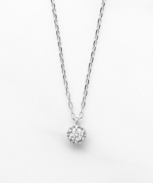 「花の女神」を意味する「FLORA」からインスパイアされた、一粒天然ダイヤモンドのプラチナネックレス。美しいきらめきを引き出すよう、ダイヤモンドをとても繊細な6本の爪でセッティング。正面はシンプルなラウンドフォルムで、石座の裏側はさりげなく六枚花をかたちどっています。さらに、石座には触れてみたくなるようなアンティーク風の細かなミルテクスチャーをプラス。モダンな表情と、やさしくフェミニンな表情を併せ持つデザインに仕上げました。「何よりも強い」という意味を持ち、永遠の絆を象徴するとされるダイヤモンド。肌身離さず着けたくなるエターナルなアイテムは、ご自身のお守りとしても、大切な方への贈り物にもおすすめです。